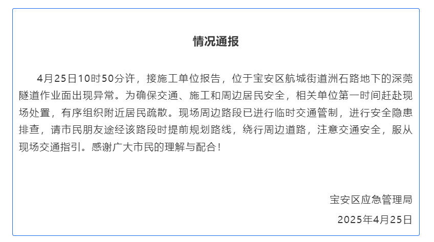 4月25日10时50分许,接施工单位报告,位于宝安区航城街道洲石路地下的深莞隧道作业面出现异常。为确保交通、施工和周边居民安全,相关单位第一时间赶赴现场处置,有序组织附近居民疏散。现场周边路段已进行临时交通管制,进行安全隐患排查,请市民朋友途经该路段时提前规划路线,绕行周边道路,注意交通安全,服从现场交通指引。感谢广大市民的理解与配合!