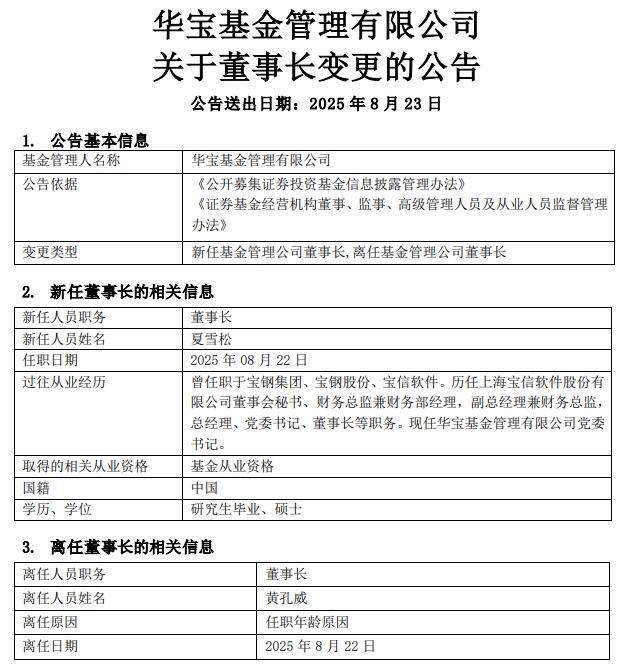 近日,华宝基金公告,董事长黄孔威因任职年龄原因卸任,来自宝武集团的“老将”夏雪松担任新董事长。